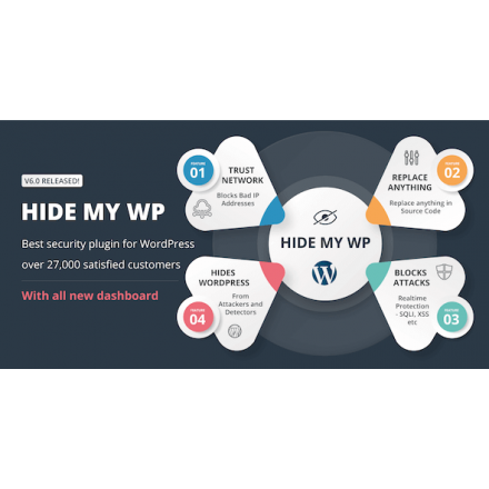 Plugin ẩn IP của Website WordPress, bảo mật chống spam, đổi link admin. Hide My WP là plugin bảo mật số một cho WordPress. Nó ẩn WordPress của bạn khỏi những kẻ tấn công, người gửi thư rác và trình phát hiện chủ đề. Hơn 26.000 khách hàng hài lòng sử dụng Hide My WP. Nó cũng ẩn URL đăng nhập wp của bạn và đổi tên URL quản trị viên. Nó phát hiện và chặn XSS, kiểu tấn công bảo mật SQL Injection trên trang web WordPress của bạn.
