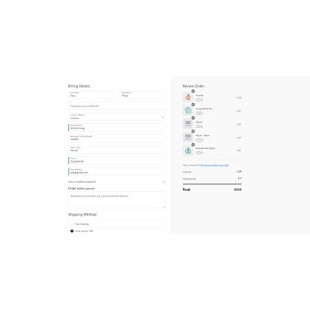 Kiểu 1: Trang thanh toán được tích hợp thành 1 trang và được chia ra thành 2 phần kiểu này tương tự trang thanh toán của haravan. Thông tin khách hàng full hết.