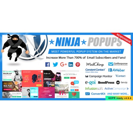 Ninja Popups cho Wordpress kết hợp một cửa sổ bật lên được thiết kế chuyên nghiệp để chuyển đổi khách truy cập trên trang web của bạn thực hiện một hành động cho dù đó là đăng ký nhận bản tin của bạn, cung cấp chiết khấu / phiếu giảm giá cho khách hàng rời khỏi hoặc khóa nội dung cho đến khi họ chia sẻ, bạn sẽ tăng số lượng người đăng ký và tín hiệu xã hội của trang web của bạn, đó là chính xác những gì google và các công cụ tìm kiếm khác muốn.Ninja Popups cho WordPress - tích hợp tất cả các hệ thống gửi thư phổ biến như MailChimp, GetResponse, InfusionSoft, JetPack, ConvertKit và nhiều hệ thống khác. Bạn có được khả năng tương thích hoàn toàn của plugin bật lên và hệ thống gửi thư - bằng API.