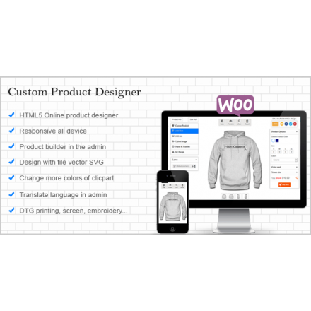 WooCommerce Custom Product Designer là plugin cho thiết kế áo quần, đồ thời trang, bạn có thể cho khách tự thiết kế mẫu áo, quần, mũ theo ý là gửi cho bạn để sản xuất, khách hàng có thể tùy chỉnh, chức năng thiết kế đa dạng, sẽ phù hợp yêu cầu của bạn.Nhiều web cho công ty về in ấn, xưởng sản xuất áo, vật liệu cũng sử dụng plugin thêm họa tiết trên ảnh này.